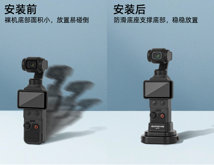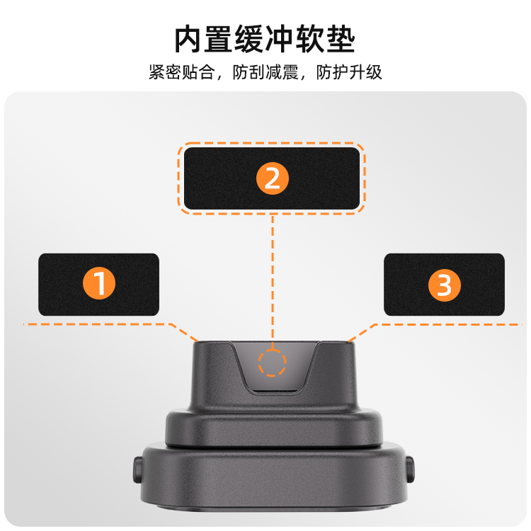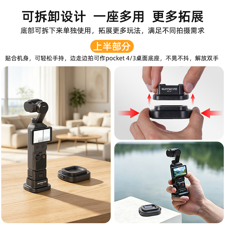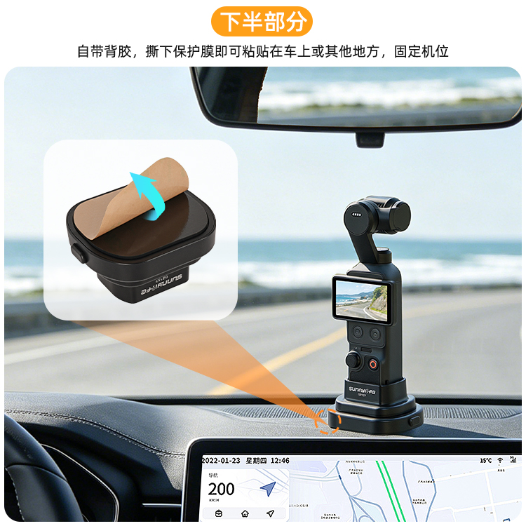 底部可拆卸设计,一座多用,更多拓展。上半部分贴合机身,可轻松手持,边走边拍; 下半部分自带背胶,撕下保护膜即可粘贴在车上或其他地方。