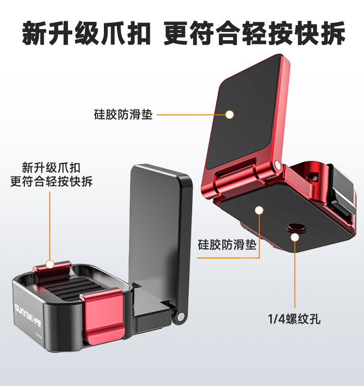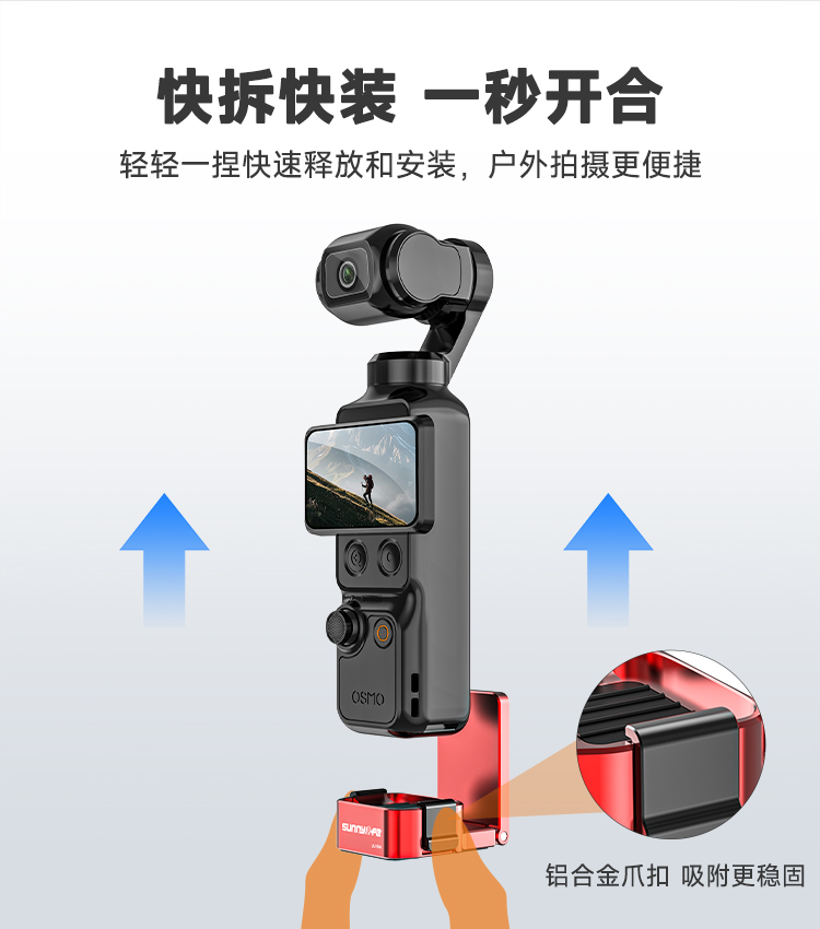 快拆快装,一秒开合。轻轻一捏快速释放和安装,户外拍摄更便捷。