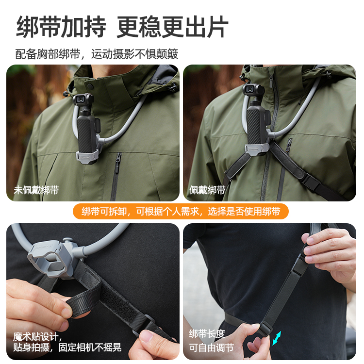 配备胸部绑带,运动摄影不惧颠簸。绑带可拆卸,可根据个人需求,选择是否使用绑带。