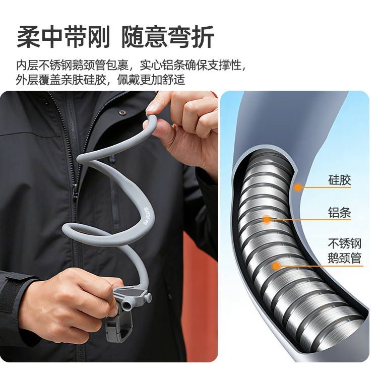 柔中带刚,随意弯折。内层不锈钢鹅颈管包裹,实心铝条确保支撑性,外层覆盖亲肤硅胶,佩戴更加舒适。