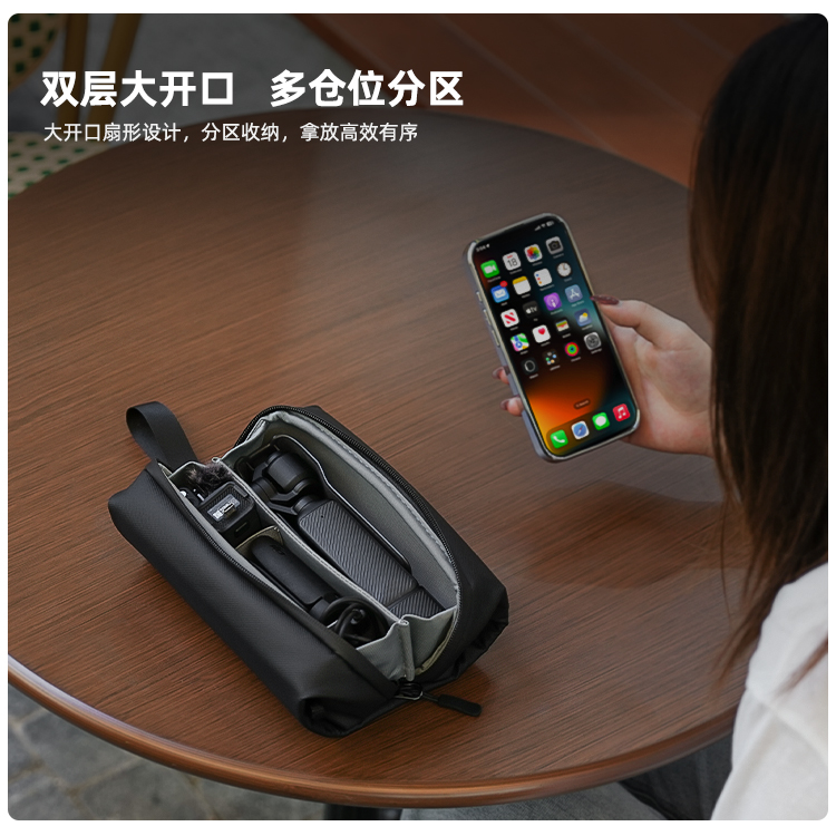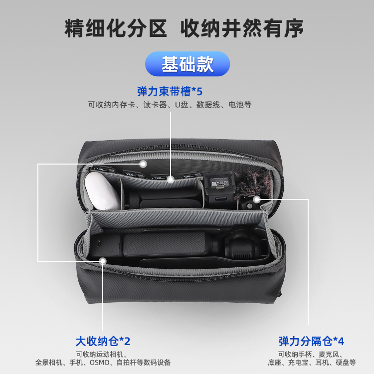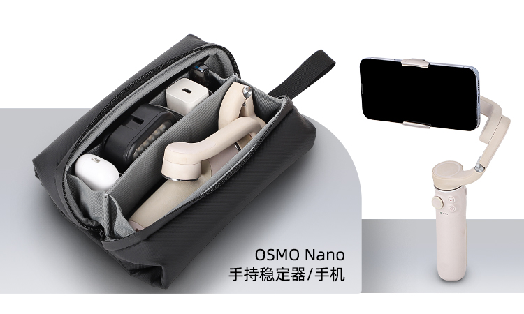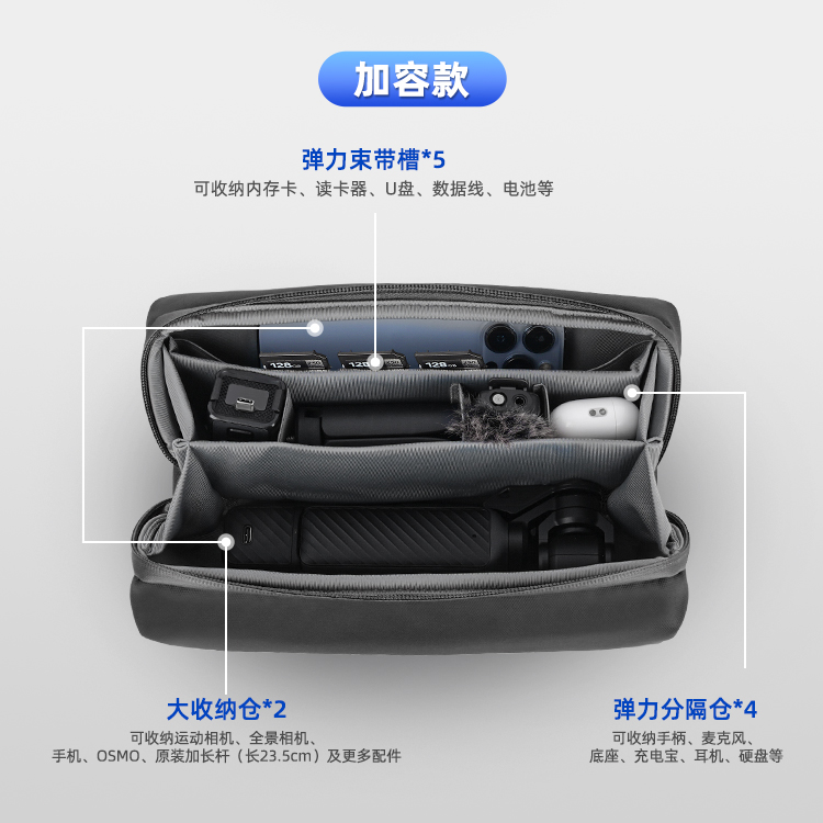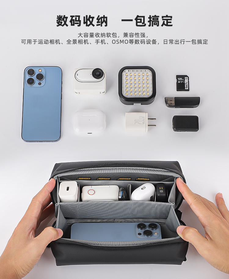 大容量收纳软包,兼容性强,可用于运动相机、全景相机、手机、OSMO等数码设备,日常出行一包搞定。