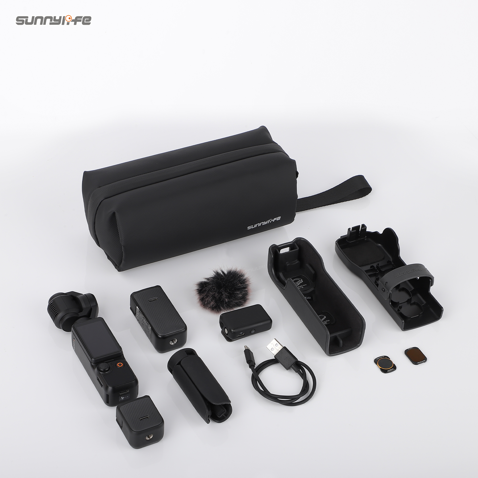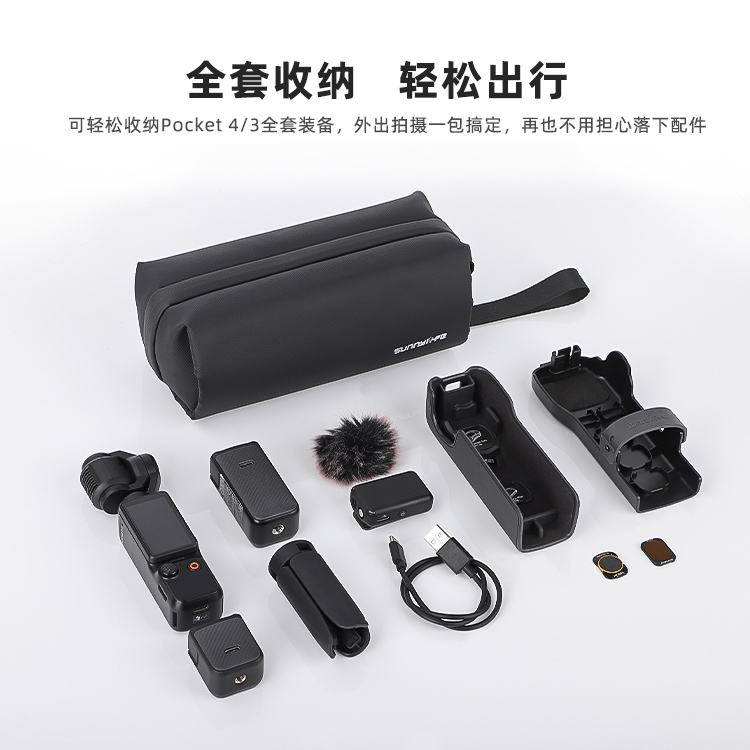 全套收纳,轻松出行。可轻松收纳Pocket 4/3全套装备,外出拍摄一包搞定,再也不用担心落下配件。